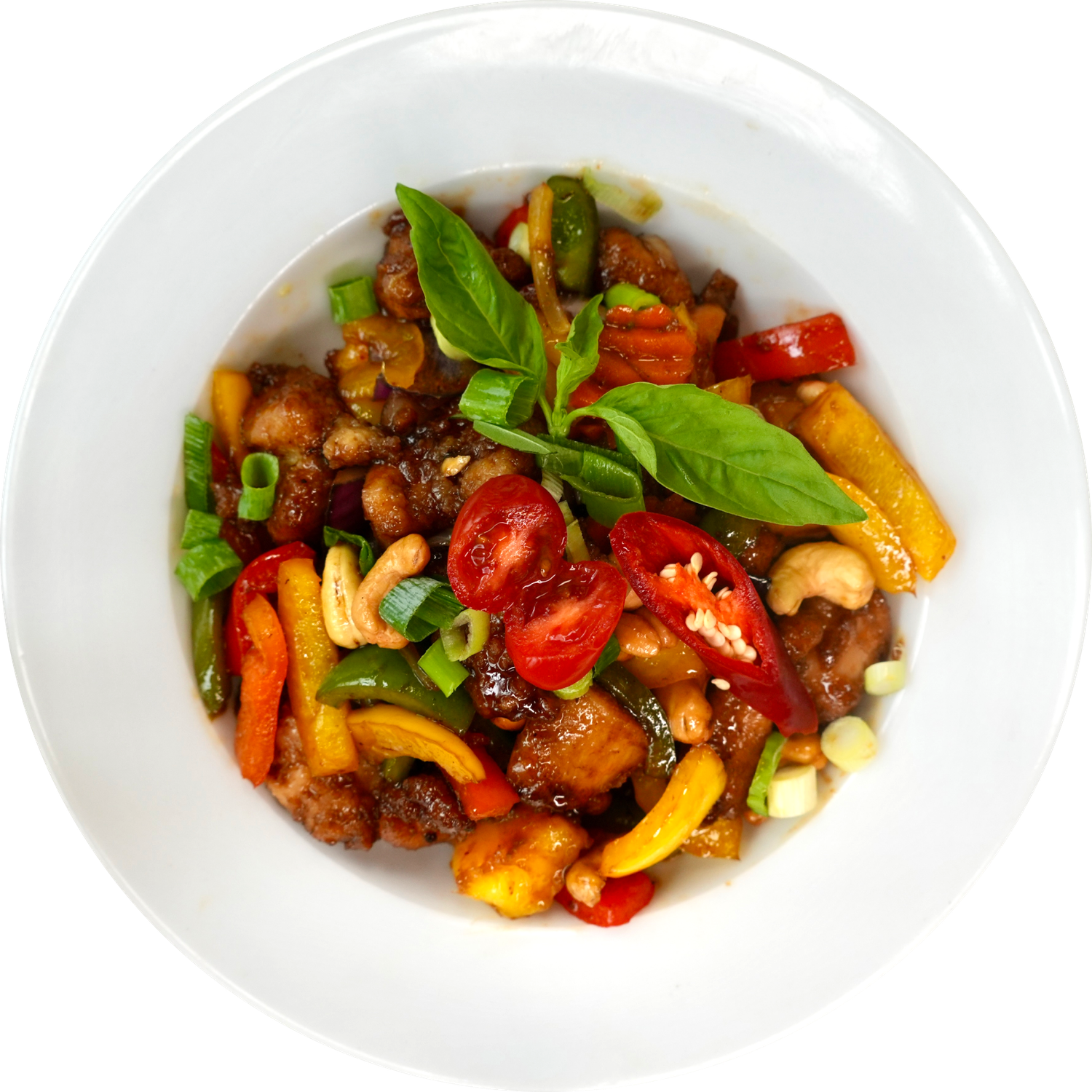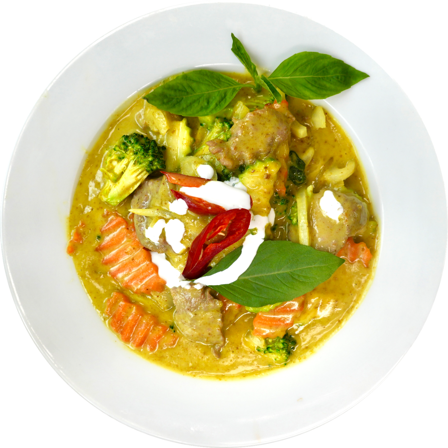 Fresh and spicy green curry with coconut milk and seasonal vegetables.
