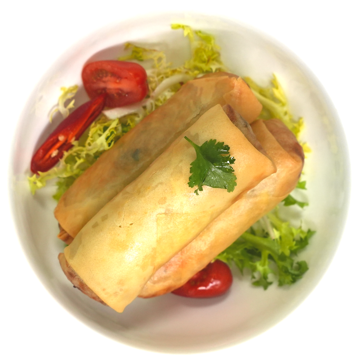 Homemade spring rolls filled with seasoned chicken and vegetables.